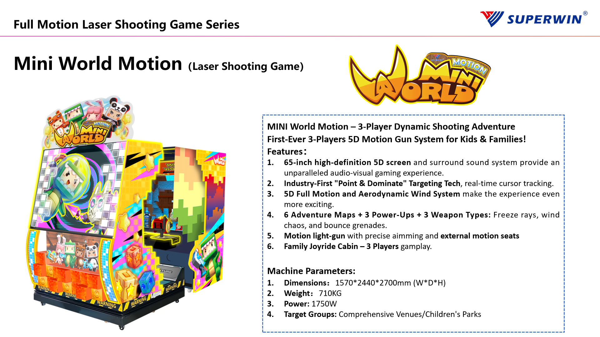 MINI World Motion is the ultimate family attraction, pioneering the industry's first-ever 3-player, 5D motion gun system. The high-energy Family Joyride Cabinet immerses players with its 65-inch HD 5D screen and powerful surround sound, complemented by full 5D motion seats and an Aerodynamic Wind System for sensational physical feedback. Targeting is intuitive and precise thanks to the innovative "Point & Dominate" real-time cursor tracking on the responsive motion light-guns. With 6 unique Adventure Maps, 3 Power-Ups, and a fun arsenal of 3 Weapon Types like Freeze rays and bounce grenades!